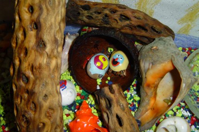 A hermit crab's environment has to be very secure and safe or they will die. The two most important things is that you have extra shells that is bigger then their shells. Also they should not get too hot or too cold. For example if the tempertaure is 80 and you change it at least 5 degrees higher or lower they could possibly get sick or die. You can see in this picture that I have sticks for my hermit crabs. But if you're going to buy hermit crabs or you have hermit crabs do not get sticks from the wild. Go to the pet store and buy these kind of sticks so the hermit crabs can sitck their legs in and climb up. I also have coconut shells cracked in half. You might wonder why there are coconut shells in a hermit crab environment. You don't need to put in a coconut but you can see that my two hermit crabs like having a cocnut. Even though that shell is lot bigger than them it is still a lot of fun to climb on top and hide inside. But don't put in too big a shell because the blue hermit crab in this picture got stuck and almost didn't get out. We had to use oil. That was 5 weeks ago. They also need a 10 gallon tank or more.Their environment has to be moist. You can feed them any vegetable or fruit or hermit crab food. They also need water in their tank. You also have to clean their tank once a month or more. |